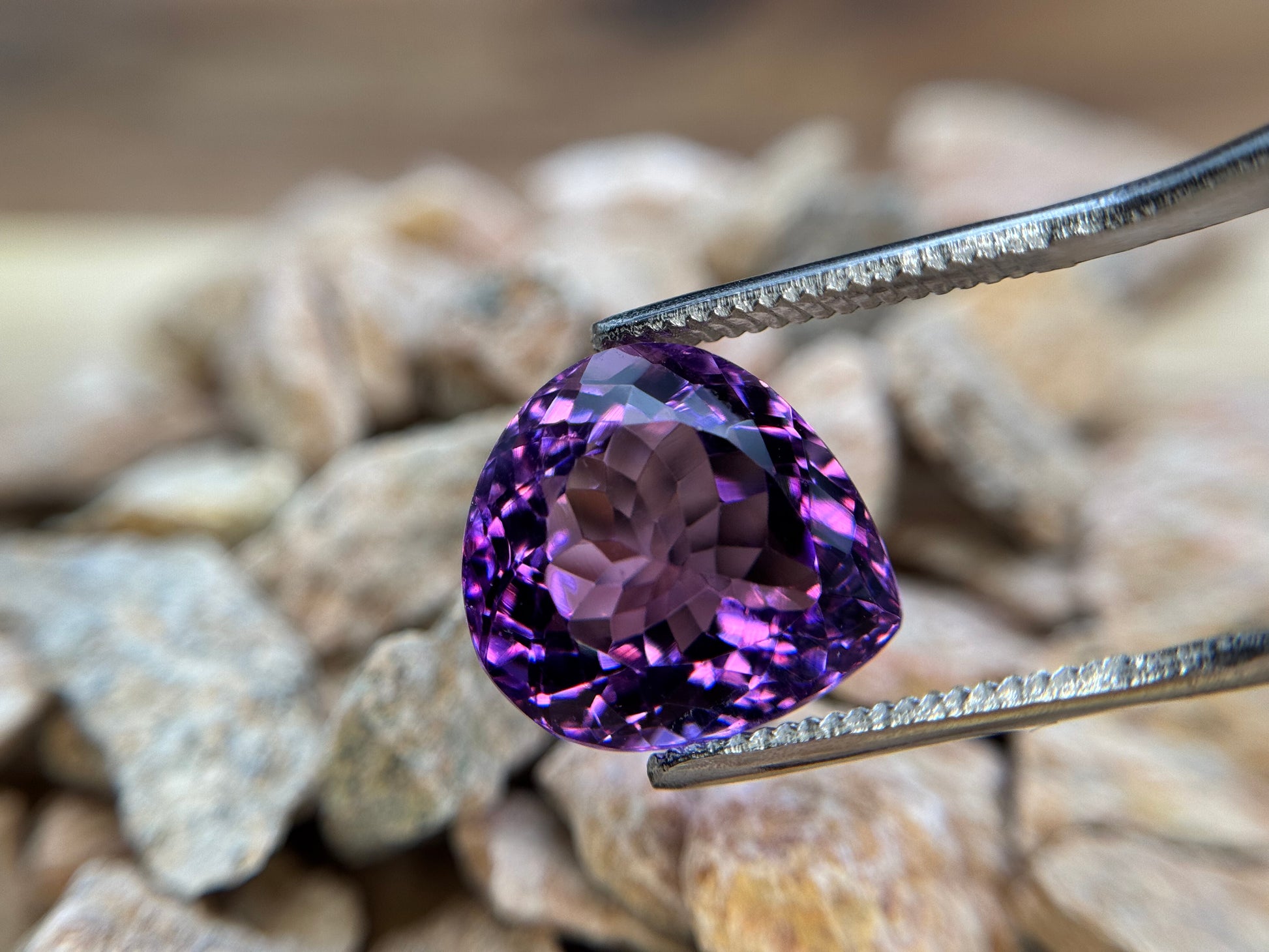 Celebrate love and elegance with the Amor Eternal Amethyst, a stunning 13.12-carat heart-shaped gemstone from the lush mines of Brazil. This breathtaking amethyst radiates with a deep, enchanting purple hue that symbolizes clarity, serenity, and timeless beauty. Its precision-cut heart shape makes it the ultimate symbol of affection and sophistication, ideal for meaningful and exquisite jewelry designs.